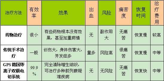 由图可知,传统的药物治疗和手术治疗,对于治疗前列腺增生都存在很大的不足,特别是传统手术治疗,创伤大、风险高,特别是老年患者,一般医院是不敢进行手术的。因为老年病人身体条件有限、往往患有各种心脑血管疾病,故不能实施手术或者不能忍受手术带来的痛苦,不得不放弃手术治疗。所以,治疗前列腺增生应该去专业男科医院,选择前沿的微创手术疗法。
