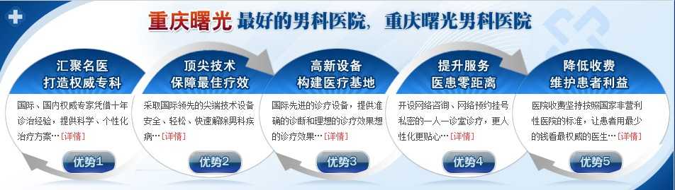 (一)全国受欢迎男科医院,汇男科名医,创百年曙光男科。重庆曙光男科医院连续被评为全国受欢迎的专业男科医院,得到重庆卫生部的高度承认,同时也成为了重庆较专业的男科医院。