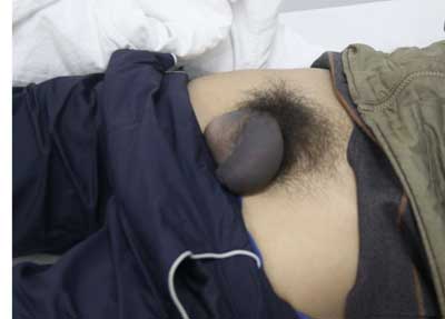 在重庆曙光男科医院四楼住院病房,记者见到了这次事件的主角,刚刚手术完的汪某,据他回忆:16日早上,“小弟弟”出现晨勃现象,当时有点兴奋,于是象往常一样通过手淫来获得一下快感。正性起时,突然听到“咔嚓”一声,随后就感觉到下体剧烈的疼痛,生殖器出现肿胀、淤血,一会儿整个阴茎、阴囊全部变黑,当时把他及全家人吓坏了。