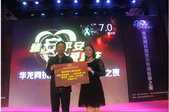 2013年5月3日晚19:30分,在重庆市市慈善总会、华龙网联合主办的“雅安平安,大爱重庆——华龙网抗震救灾专场慈善之夜”活动现场,重庆曙光男科医院再次捐赠医疗物资近8万元,被社会各界赞为重庆具爱心的医院。